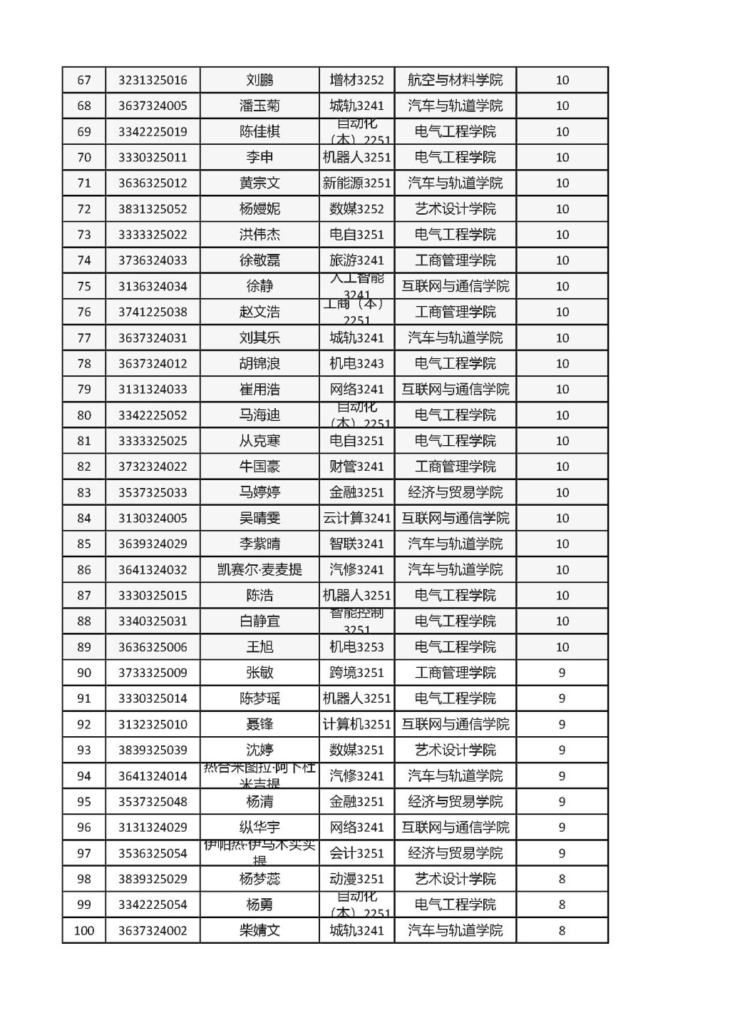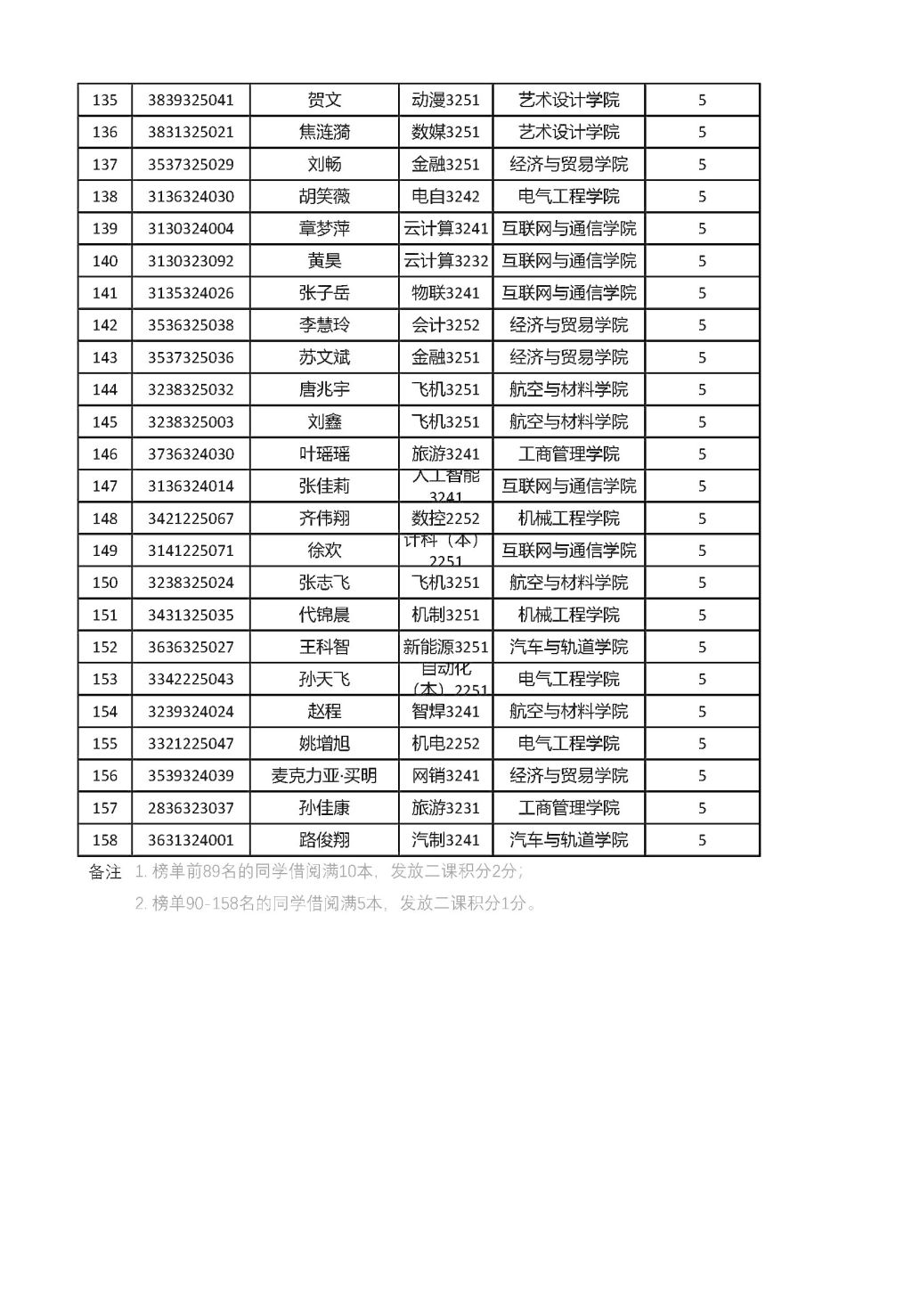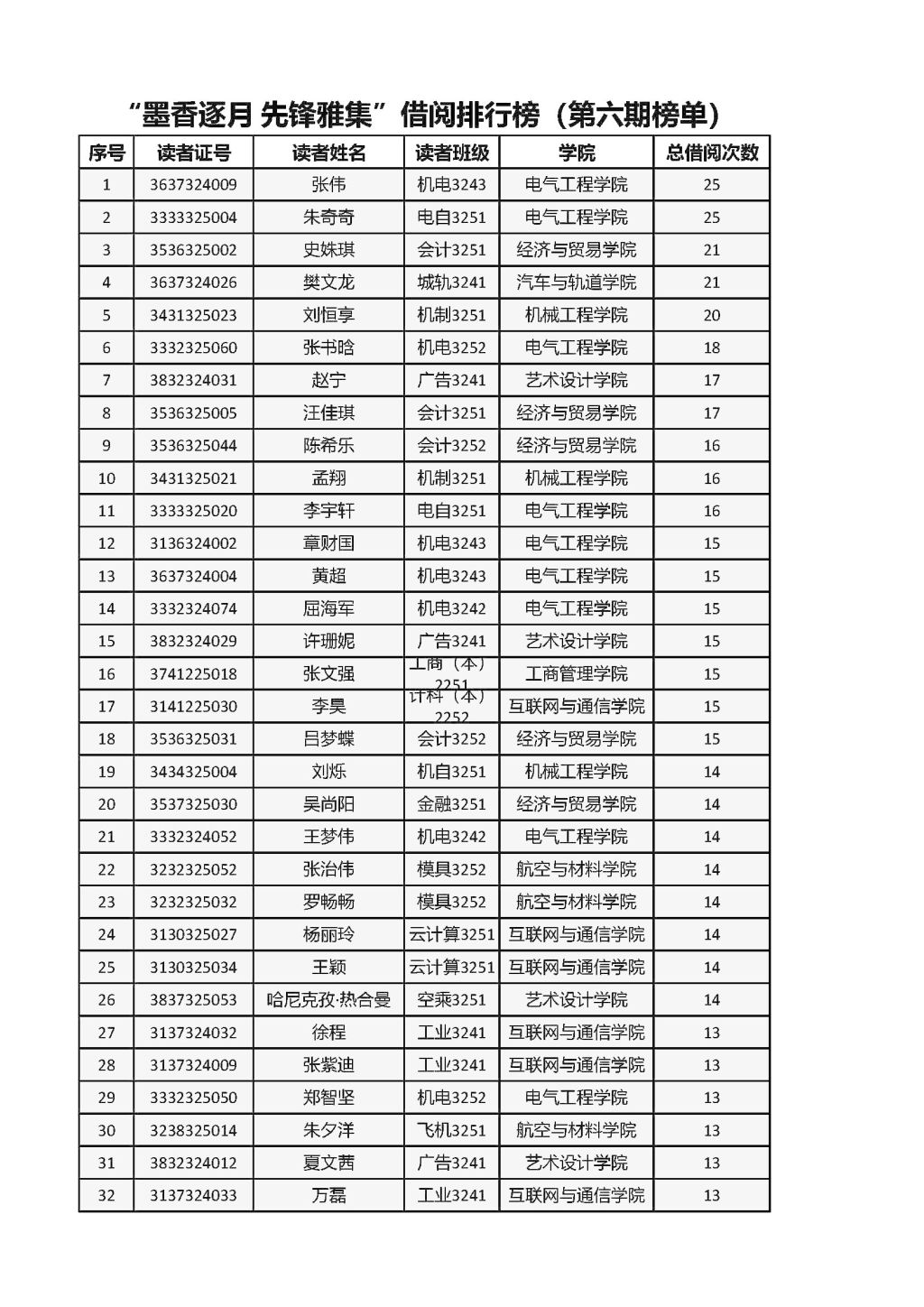 为鼓励广大读者积极借阅书籍,图书馆在2025年开展借阅排行榜活动,通过借阅量的比拼,促使大家深度探索馆藏书籍,让阅读成为日常习惯,让书香满溢校园,在书香氛围里共享求知乐趣,提升文化素养。阅读排行榜活动第六期于11月1日上线,至11月30日结束,全校200余名同学报名,最终158位同学借阅图书满5本及以上成功上榜,现将榜单公布如下。其中榜单前89名的同学借阅满10本,发放二课积分2分;榜单90-158名的同学借阅满5本,发放二课积分1分,二课积分已发放。